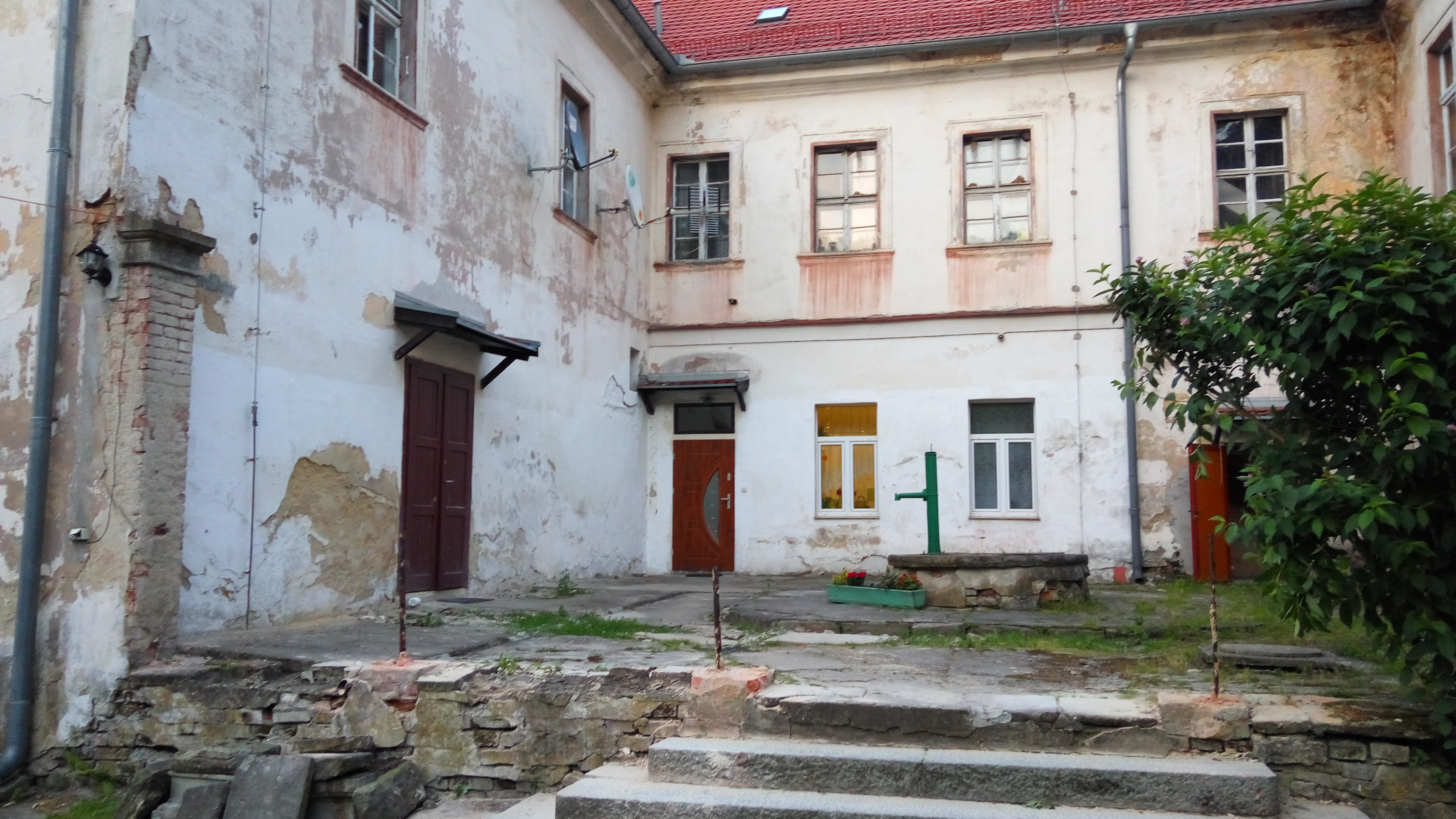 Powyżej widać zdegradowany tynk, dawną studnię oraz liczne zacieki po czerwonej farbie, którą przy poprzednim remoncie malowano wnęki okienne (świadkowie mówią, że spłynęło po pierwszym dużym deszczu).