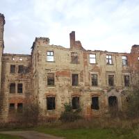 - Zdjęcie wieży od frontowej ściany (południowej) pałacu w Maniowie Małym, obecnie w stanie ruiny. Obiekt znajduje się przy ulicy Parkowej, między numerami 3 i 5.