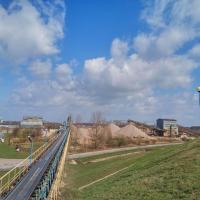 Ujęcie wielokondygnacyjnego, industrialnego kompleksu płuczki i sortowni kruszyw naturalnych zakładu wydobywczego Eurovia w Mietkowie. Budynek wzniesiony na stalowych estakadach, umożliwiających grawitacyjny załadunek wyselekcjonowanego żwiru do podstawionych poniżej pojazdów ciężarowych i wagonów kolejowych, z widoczną ładowarką czołową u podstawy i przenośnikiem taśmowym po lewej stronie.