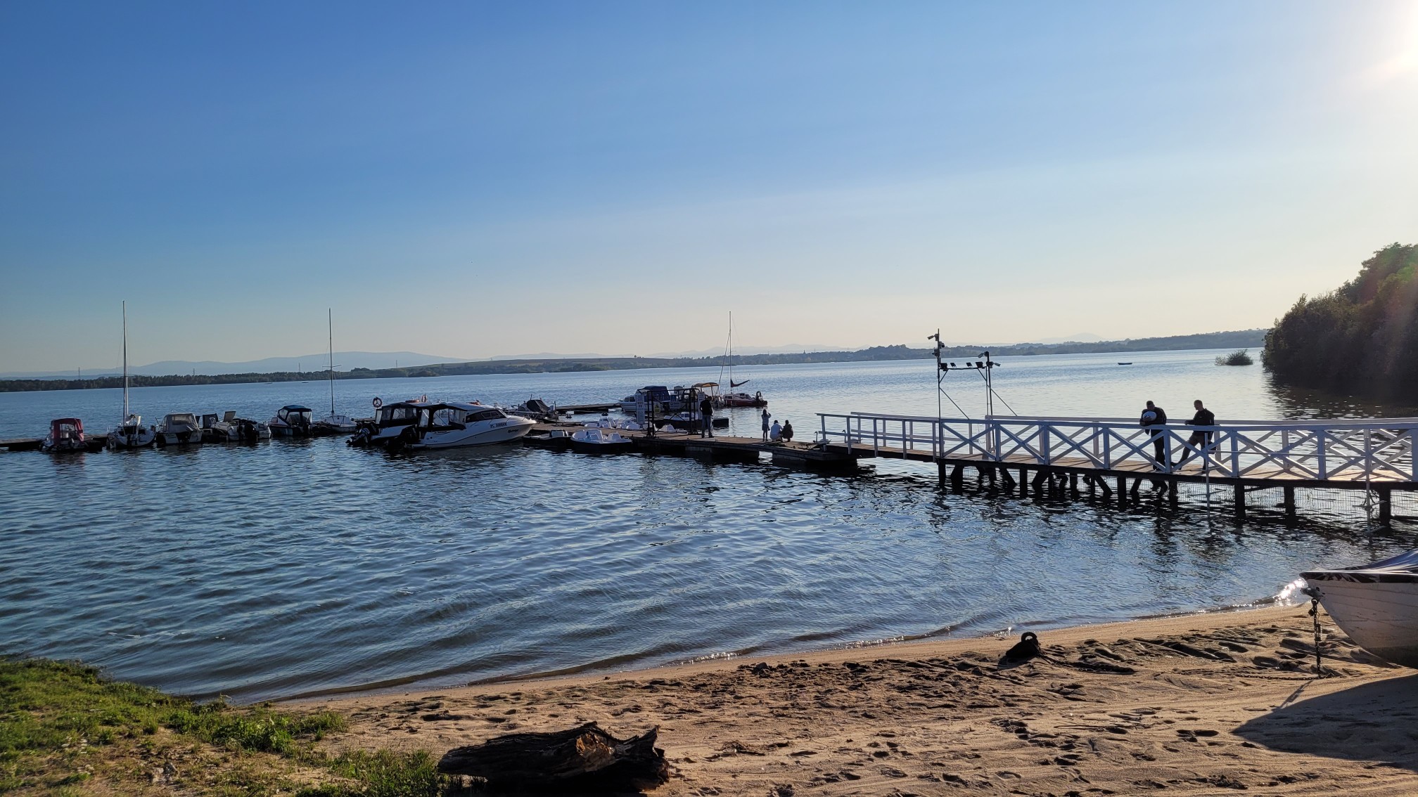 - Widok ze slipu na pomost w Ośrodku Sportów Wodnych w Borzygniewie. Na plaży widać cofającą się wodę, a na pomoście stoją ludzie. To miejsce jeszcze 3 doby wcześniej było pod wodą. Zdjęcie wykonane 21 września 2024 około godziny 17.