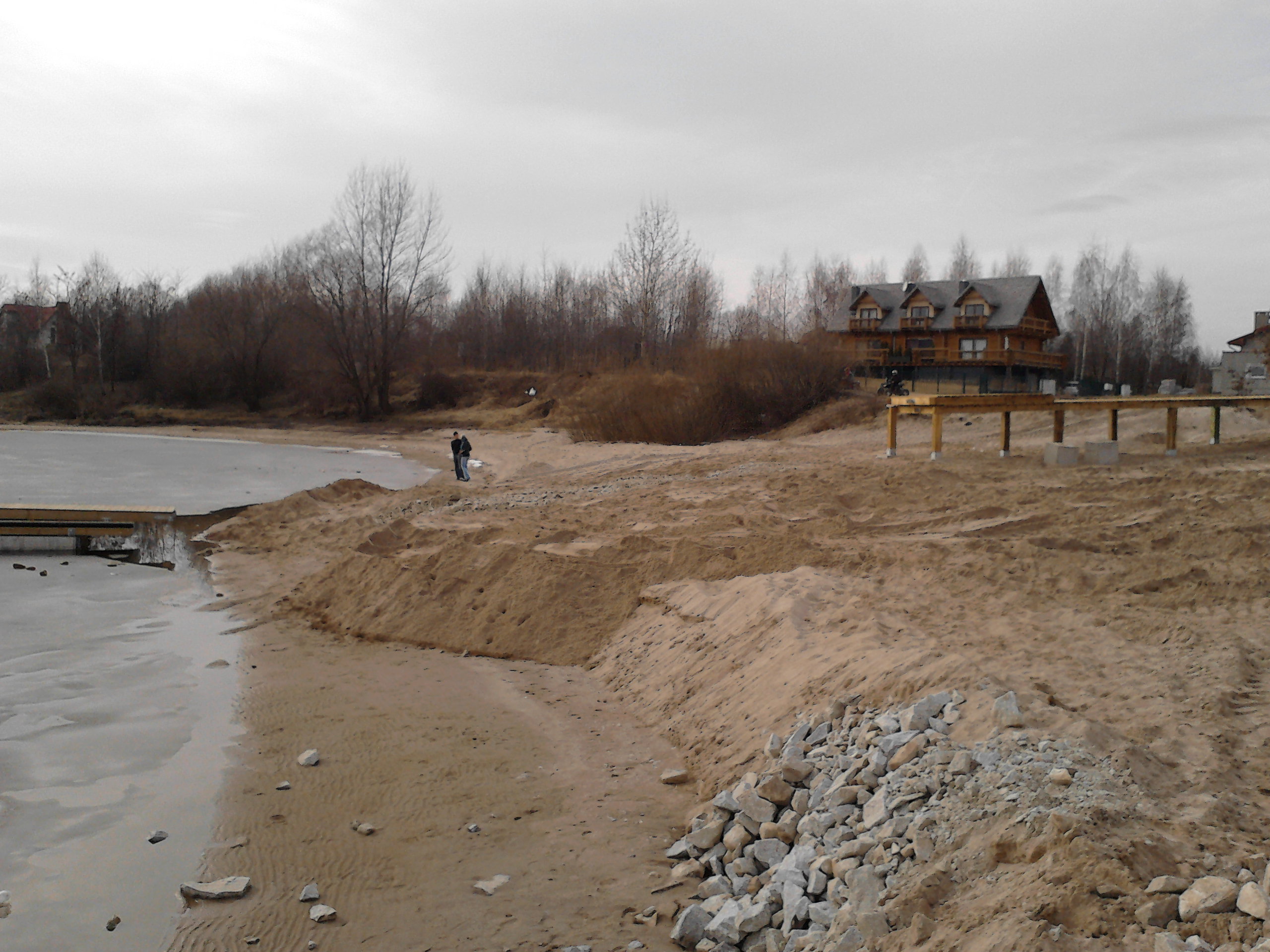 - Zdjęcie plaży w Ośrodku Sportów Wodnych w Borzygniewie w czasie budowy w marcu 2011 roku. Widoczne elementy pomostu i część pływająca. Zdjęcie wykonane z perspektywy slipu na zachód.