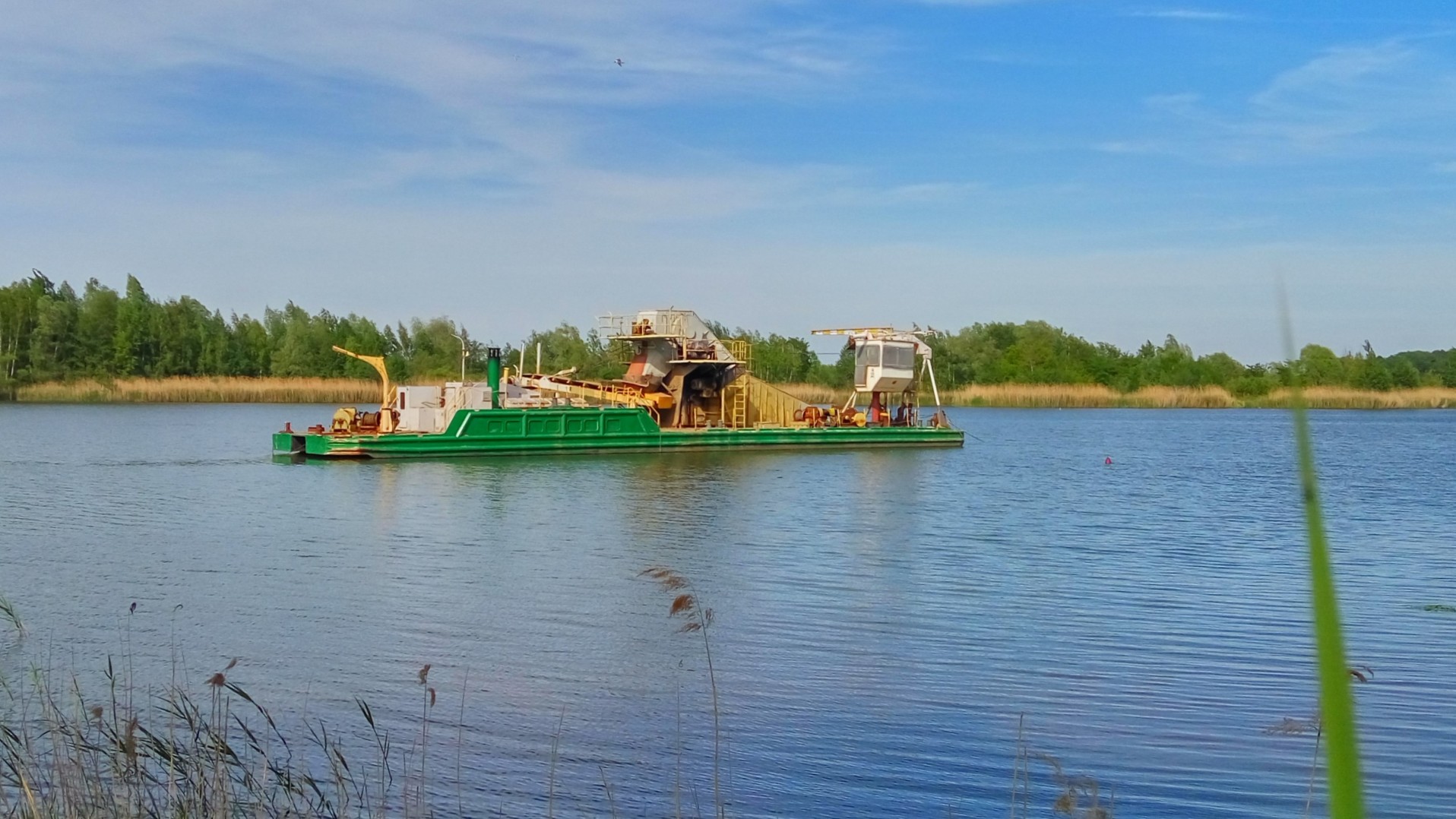 - Zdjęcie przedstawia barkę wykorzystywaną przy wydobyciu żwiru z kopalni na terenie Maniowa i Proszkowic. Zdjęcie wykonano z plaży na cyplu. Numer seryjny nie jest znany.
