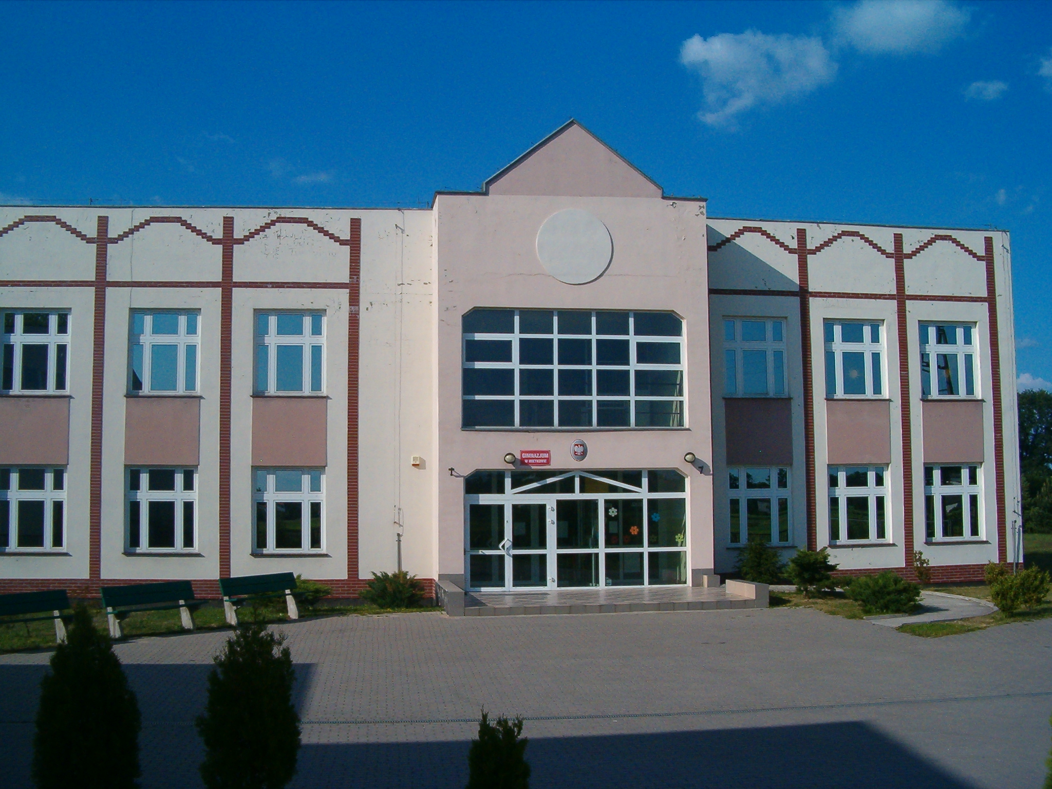 Co nam to mówi: Widoczny stan budynku z 2006 roku świadczy o ówczesnych inwestycjach w oświatę wiejską i dbałości o estetykę otoczenia (uporządkowany podjazd z kostki betonowej, ławki, nasadzenia krzewów). Tablica „Gimnazjum” jest dziś elementem historycznym, przypominającym o nieistniejącym już szczeblu edukacji w polskim systemie szkolnictwa.